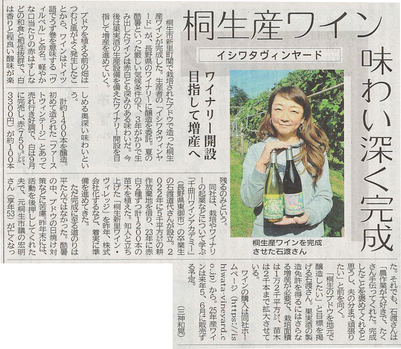 群馬・桐生産ワインが味わい深く完成 イシワタヴィンヤード、ワイナリー開設を目指して増産へ 2025/11/20